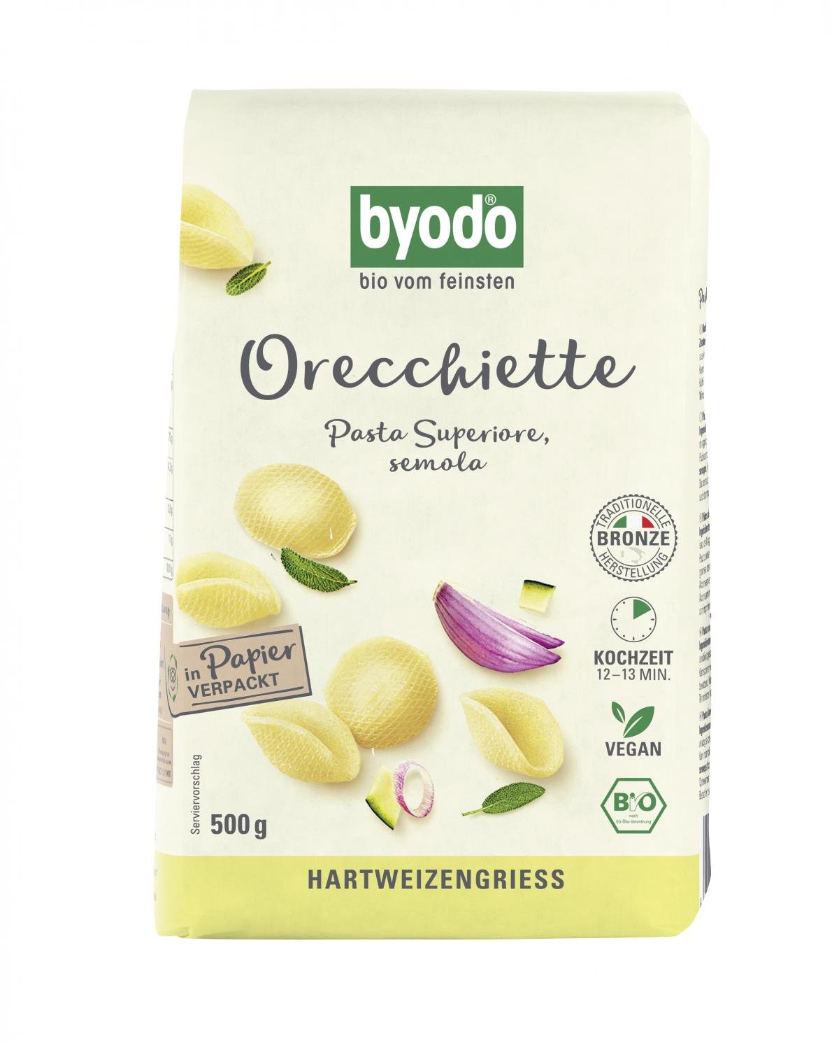 Die hellen Byodo Orechiette begeistern mit ihrem feinen Geschmack, perfekten "al-dente"-Biss und tollen Kocheigenschaften.