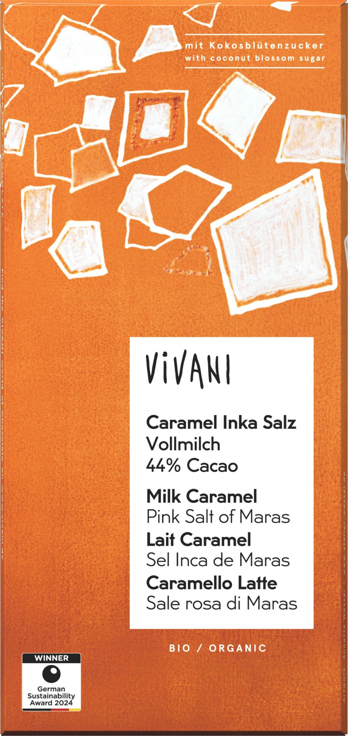 Vollmilch Schokolade mit einem hohen Kakaogehalt von 44%, Caramel Crisps und einer Prise Inka Sonnensalz. Der enthaltene Kokosblütenzucker verleiht der Schokolade zusätzlich eine karamellige Note.