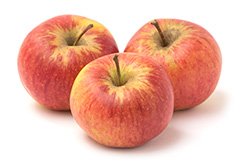 Mittelgroße Äpfel mit gelber Schale, die von leuchtend roter, gemaserter Deckfarbe überzogen ist. Das Fruchfleisch des Rubinola Herbstapfels ist knackig, feinzellig und von süß-säuerlichem Aroma.