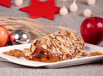 DINKELmehl 630er*, Sultaninen*, BUTTER*, Margarine* (Sonnenblumenöl*, Palmfett*), Wasser, Honig*, Zitronat* (Glukosesirup aus Maisstärke*, Zitronenschalen*, Salz), Orangeat* (Glukosesirup aus Maisstärke*, Zitronenschalen*, Salz), MARZIPAN* (MANDELN*, Honig*, Wasser*), MANDELN*, Hefe*, Rum*, DINKELvollkornmehl*, Zitronensaft*, DINKEL-Backmittel* (Rohrohrzucker*, GERSTENmalzmehl/Extrakt*, LUPINENmehl*, Acerola-Extrakt*), Meersalz, Zitronenschalenpaste* (Rübenzucker*, Zitronen*, Zitronensaft*, Zitronenöl*), Stollengewürz* (Zimt*, Ingwer*, Nelken*, Cardamom*, Macis*, Muskat*). *aus kontrolliert biologischem Anbau. Enthält folgende Allergene: Glutenhaltiges Getreide, Milch, Schalenfrüchte