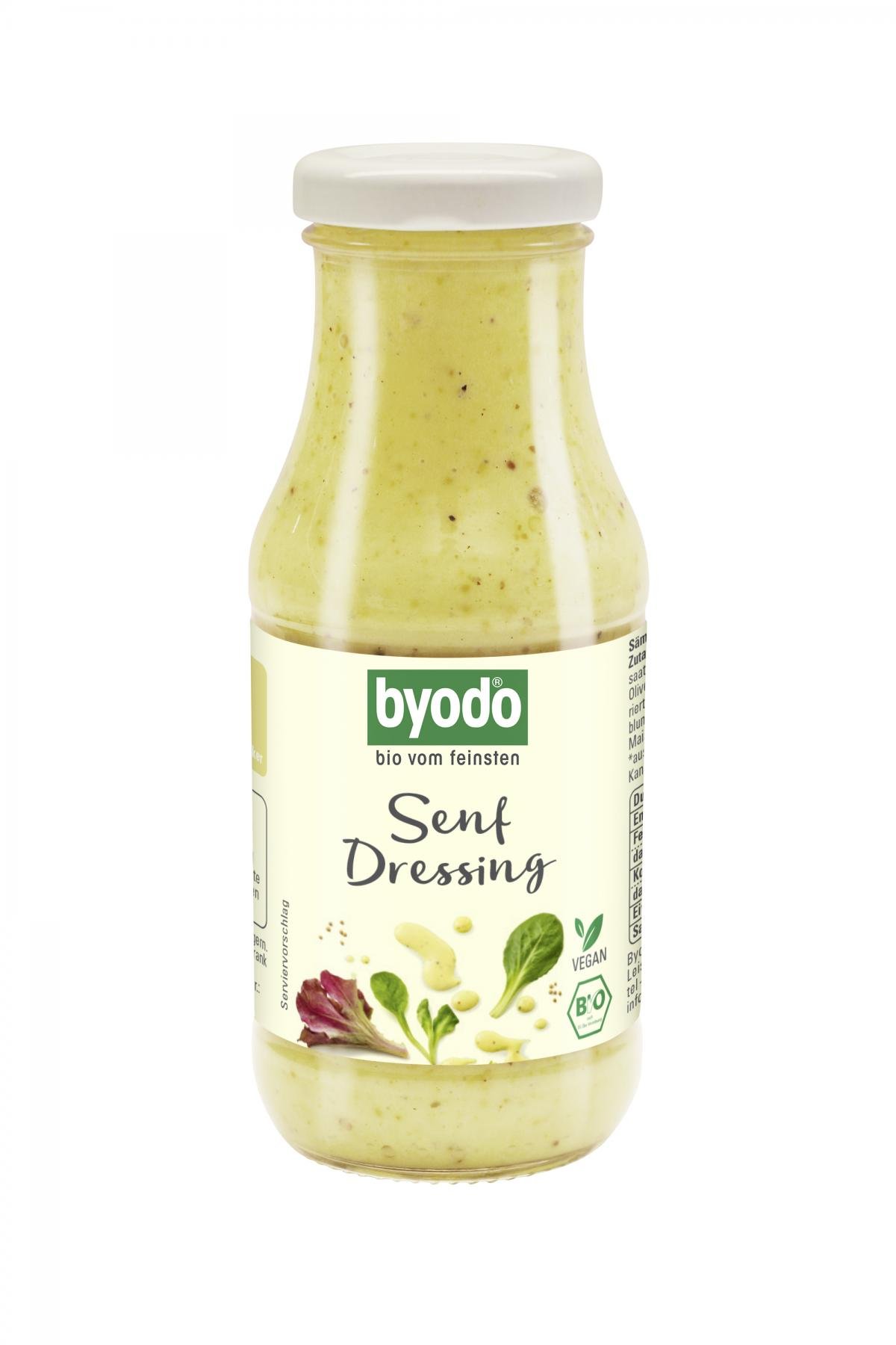 weniger anzeigenAls Salatsauce zu Gurken- und Blattsalaten verspricht das biologische Senf Dressing von Byodo ein besonderes Genusserlebnis. Unser Feinschmecker Tipp: Genießen Sie das Byodo Senf Dressing zu frischem Feldsalat mit Walnüssen und glasierten Trauben! Einfach die 245 ml-Flasche kurz schütteln, Dressing über den Salat gießen und genießen. Nach dem Öffnen bitte im Kühlschrank aufbewahren.