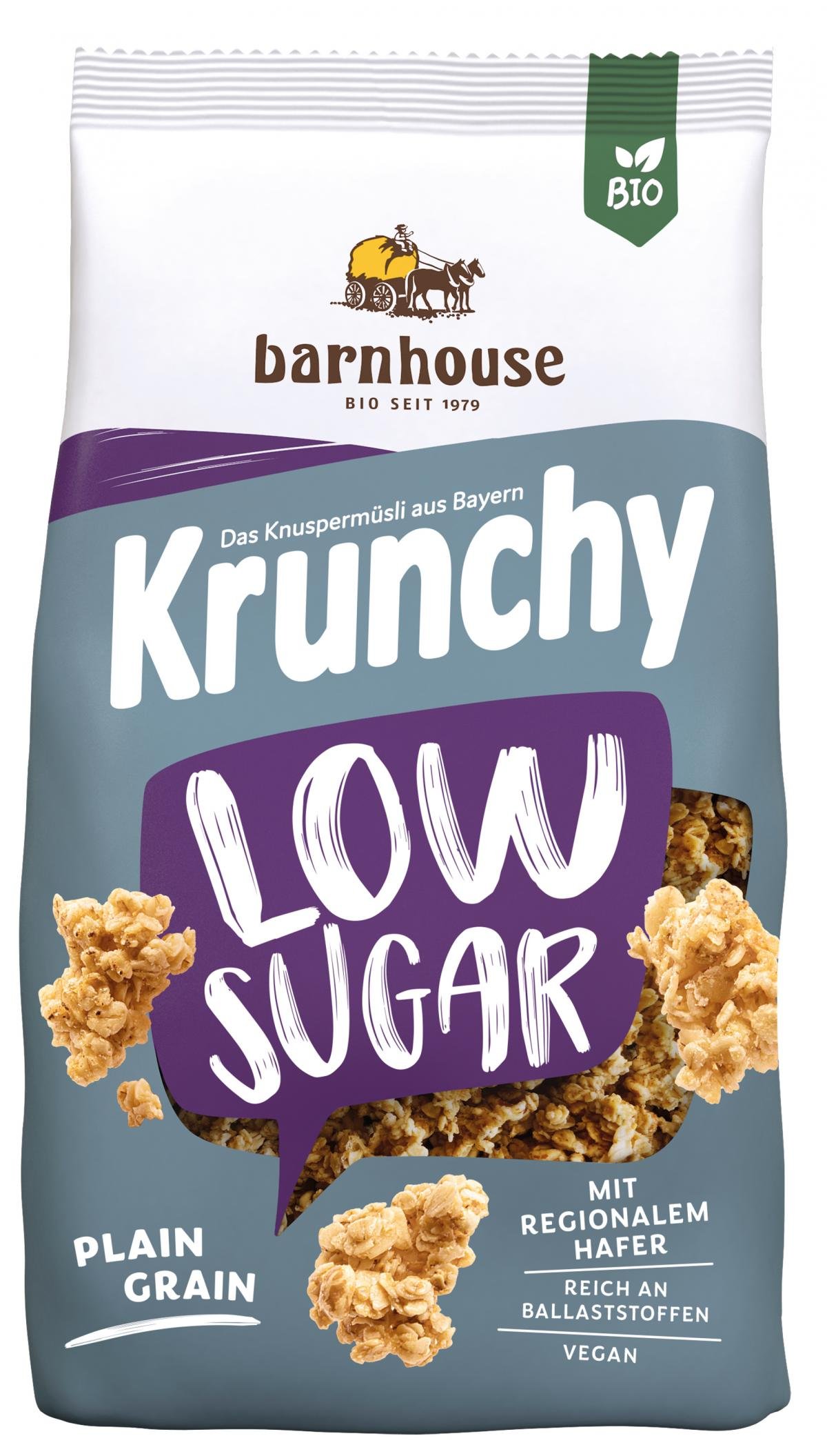Mit KRUNCHY LOW SUGAR erwartet euch eine kleine Knuspermüsli-Sensation – ein wunderbares, knuspriges Krunchy, das ebenso zuckerarm wie köstlich ist. Voller, unverfälschter Genuss in Barnhouse-Qualität für alle, die bei ihrem Müsli besonders auf wenig Zucker achten oder bisher deshalb Knuspermüsli gemieden haben.