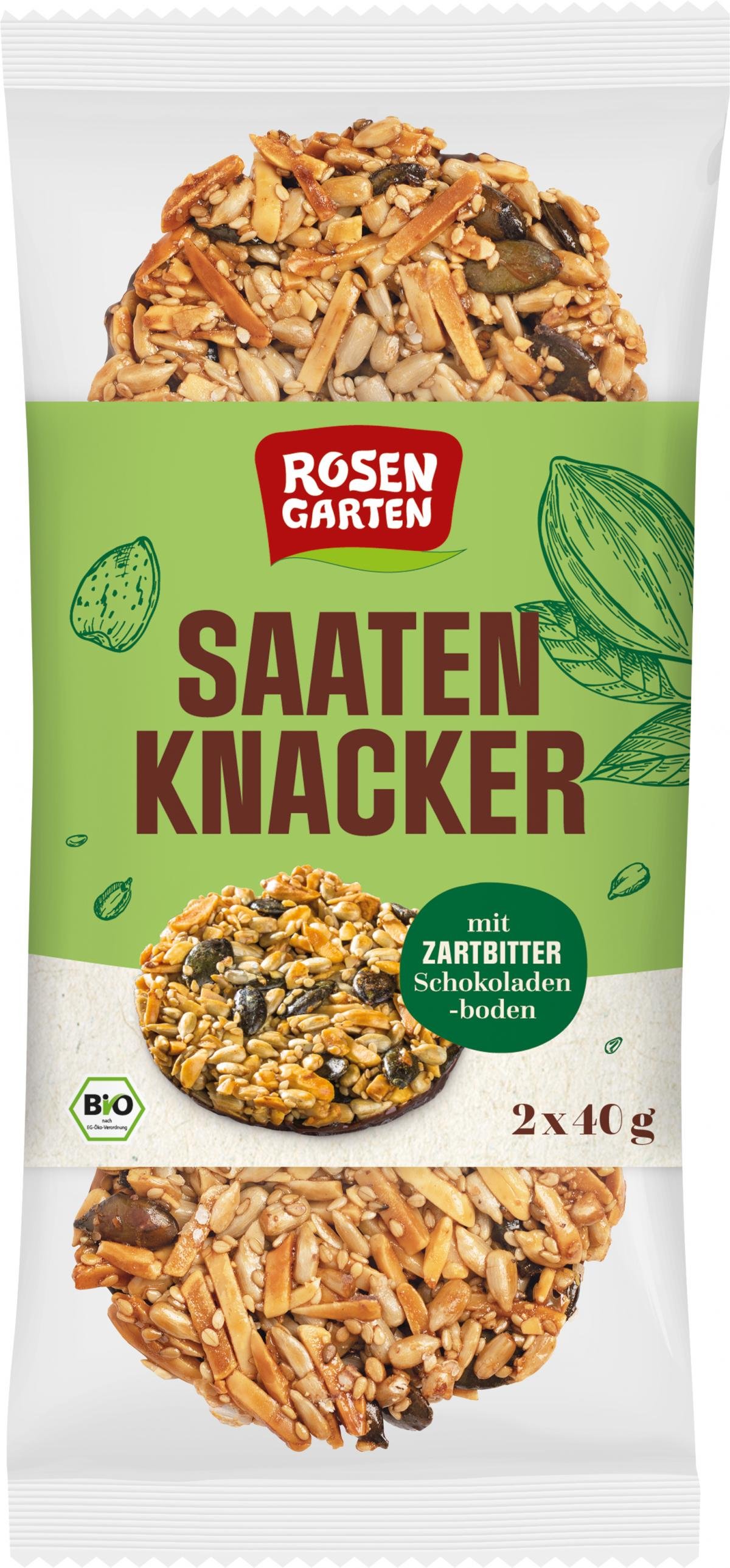 Kernig, knackig, schokoladig: Der Saaten-Knacker vereint Kürbis- und Sonnenblumenkerne, Mandeln und Sesam mit einem feinen Boden aus Zartbitterschokolade. Ganz ohne Mehl und im praktischen Duo-Pack erhältlich – ideal für den kleinen Energieschub zwischendurch.