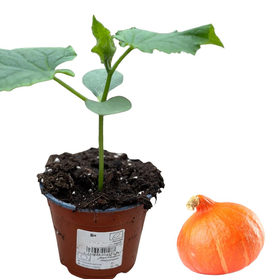 Hokkaido-Kürbisse bilden leuchtend orange Früchte mit nussigem Aroma und essbarer Schale. Sie sind vielseitig für Suppen, Ofengerichte oder Pürees geeignet.